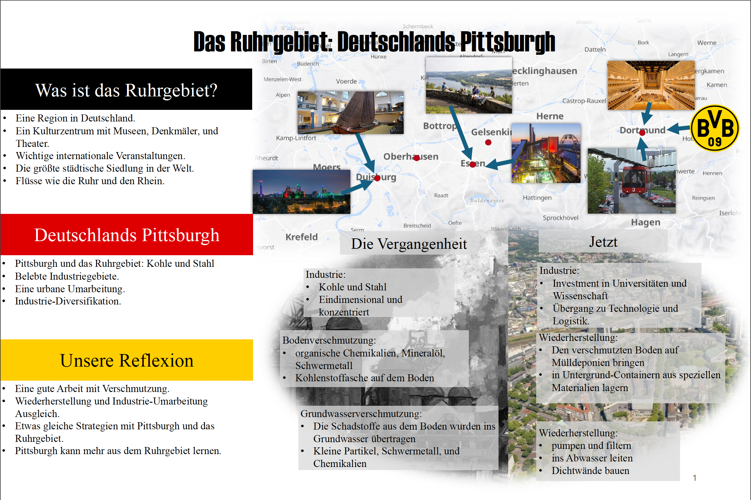 ist die größte städtische Siedlung in der Welt mit fünf Millionen Personen. Es gibt zwei wichtige Flüsse, die Ruhr und den Rhein. Städte wie Dortmund, Essen, und Bochum sind im Ruhrgebiet. Es hatte eine Kohle- und Stahlindustrie, und jetzt hat die Region eine urbane Umarbeitung und Industrie-Diversifikation erfahren.